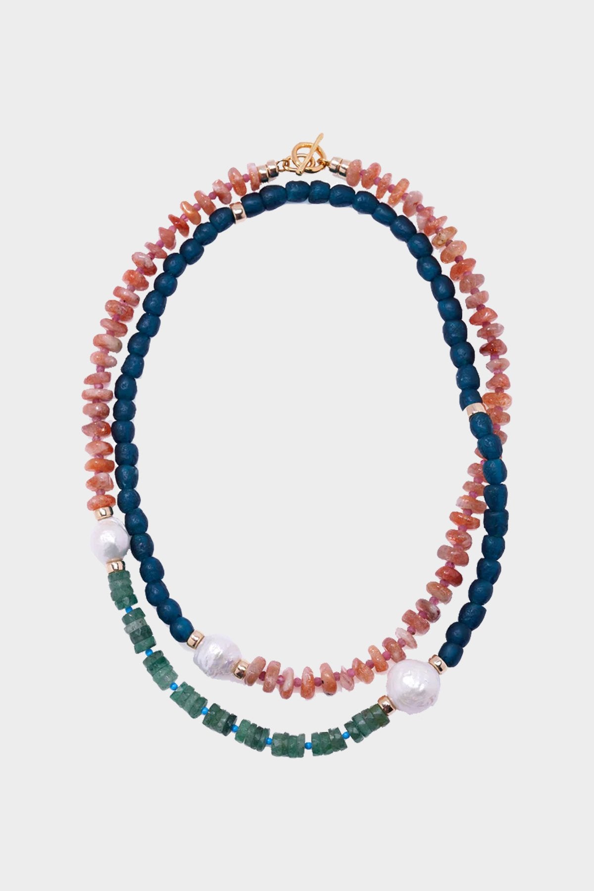 - Gold-plated brass, pink tourmaline, sunstone, green strawberry quartz, blue howlite, recycled glass, freshwater pearl